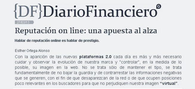 Diario Financiero, 27/03/2013.- Artículo de Esther Ortega, consultora sénior de Estudio de Comunicación, en el que expone la necesidad de la gestión de la reputación online de compañías y personas.